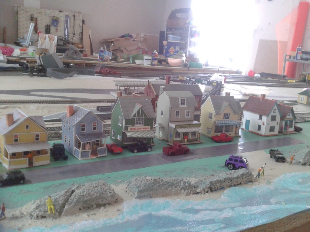 I have a few pictures for you. We are new to railroading I am doing the scenery and my DH is doing the railways, I have almost finished the beach scene and that is where I have put the buildings.