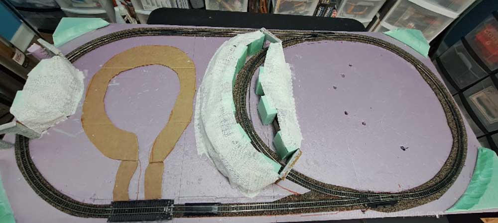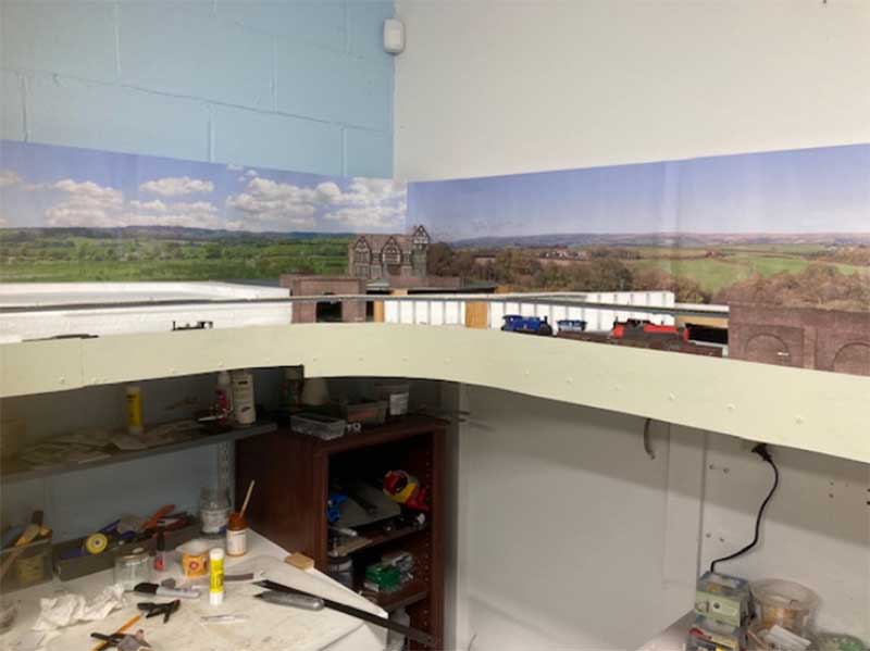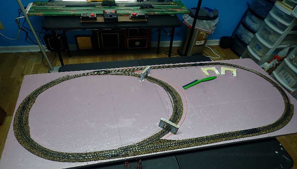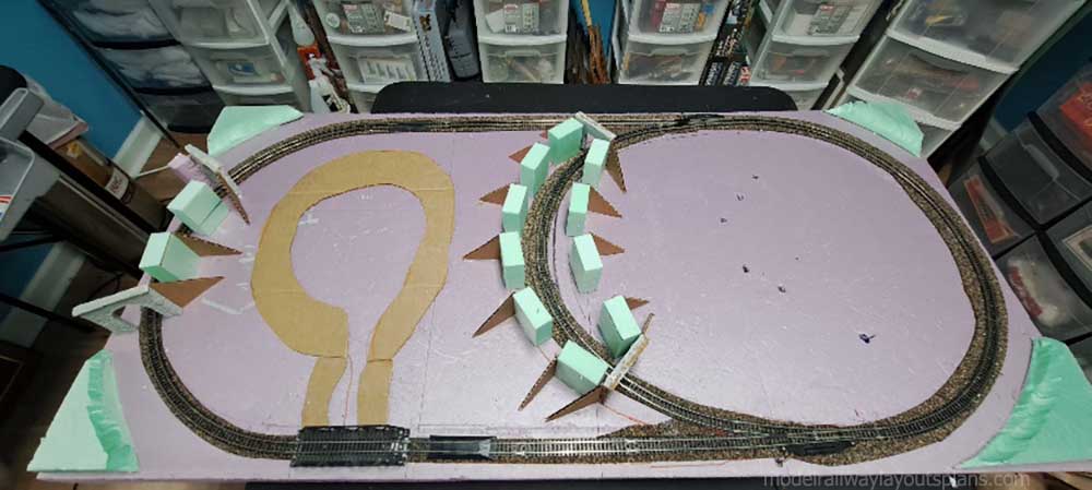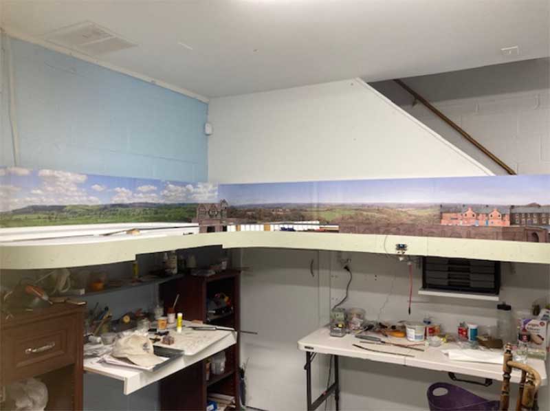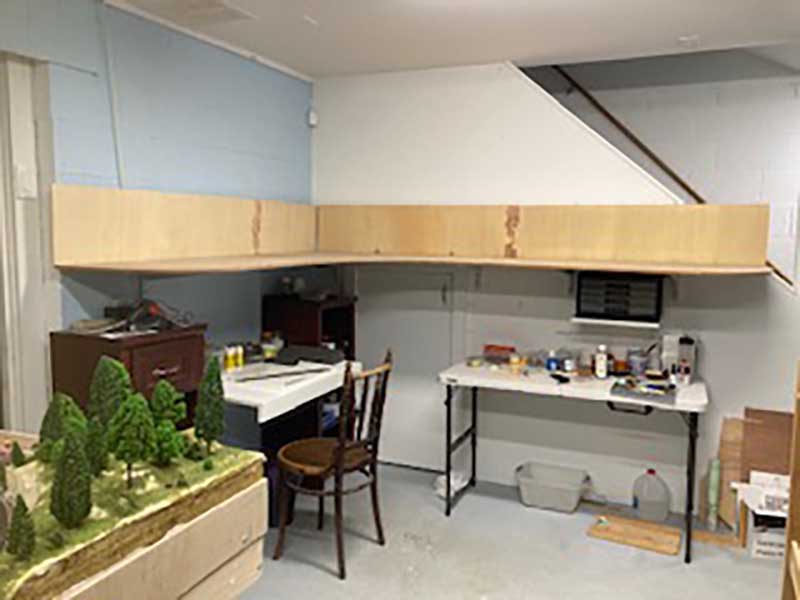 The layout will be L shaped with trains going end to end. Because I need to access the space below the stairs, the shelf is 52 inches above the floor. I have my work bench under it, and yes, I have to be careful not to bang my head when working!