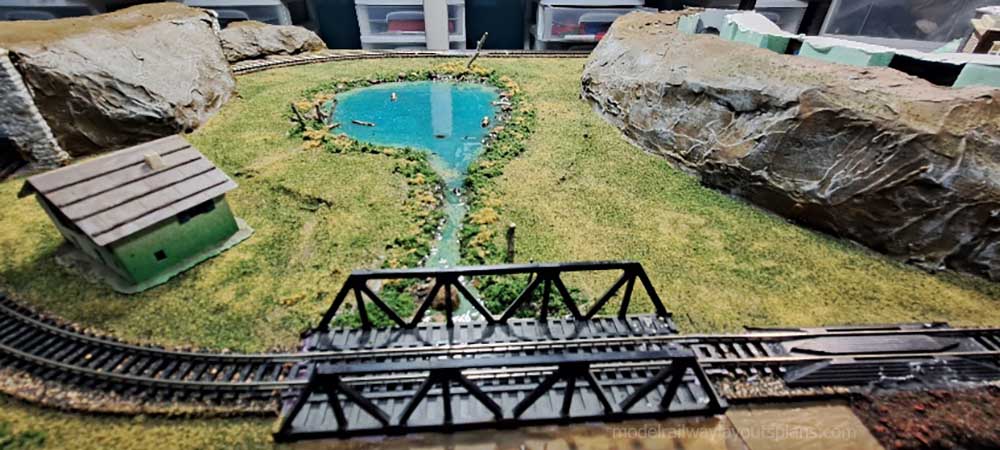 Using N gage to serve a a backdrop for my HO railroad. I tried to keep every thing as close to scale as I could. I even downloaded a dimensional drawing of a trestle from the internet which I used to scratch build my trestle.