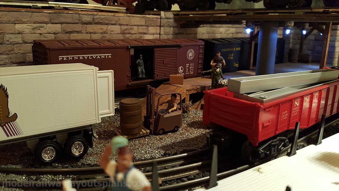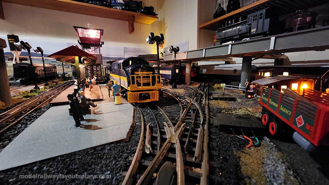 “A lot of your posters show night scenes. I never operate or show the layout in a night setting. (As you have seen, the layout is a walk in layout.It would be difficult to get around without possible damaging things on the layout.) The lighted buildings are all fully decorated inside. I built these before I had begun the layout and had the time to do them up.