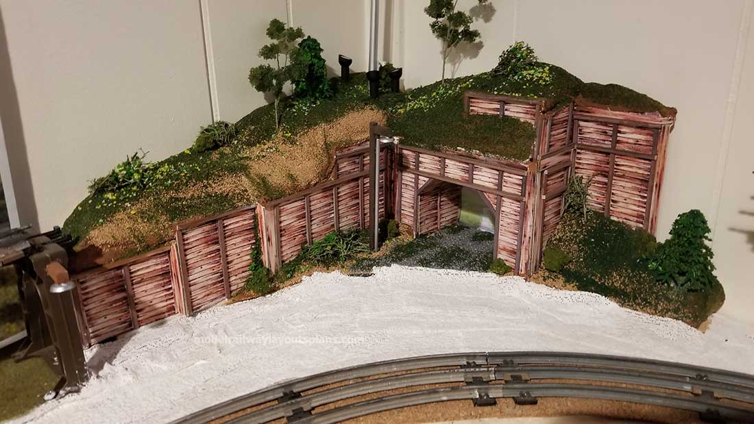 The real Erie-Lackawanna main line (now NJ Transit) ran through Bergen Hill via tunnels. On the M&K, I had to compromise and build a curved “cut” through Bergen Hill instead. The double-track portal at the west end of what would have been the tunnel encroached on real estate that I needed for the town of Marysville.