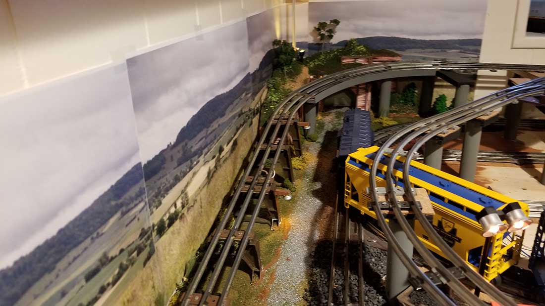 All backdrops have been installed — finally! It’s nothing fancy; just blue sky with lots of clouds. Probably too many clouds! There are some refinements to be made to better mask the seams between the backdrop sections and some repainting to be done. But it is good enough for now.