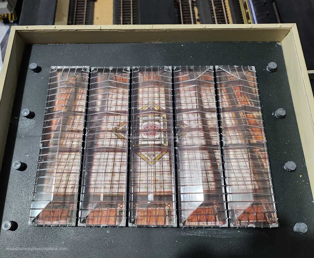 On the outside, I used photos of the actual greenish copper facade on the side of the terminal that I reduced to scale and glued those to the sides of the model. Those came out just ok. There is still some work to be done to get those to look a bit better. But, again, it is good enough for now.