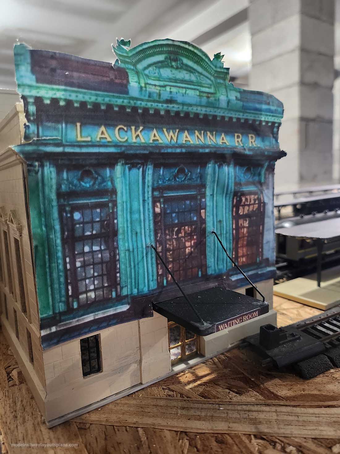 I left the front of the kit, which faces away from the layout, open so that visitors can look inside to see a detailed interior of the main waiting area of the actual terminal. To get that effect, I reduced to scale color photos of the interior of the real terminal and glued them to the model’s walls in the appropriate places. It was painstaking work and there were a lot of reprintings of photos to get the proper scale.