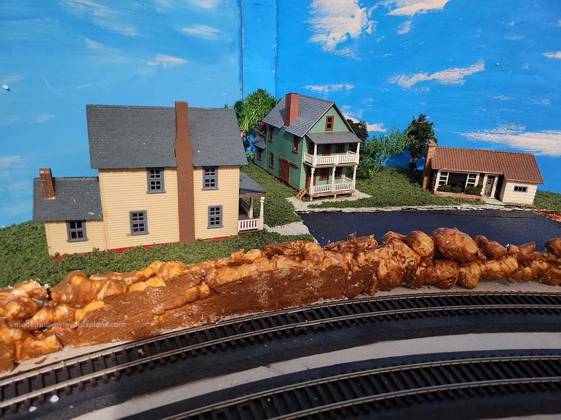 Speaking of Highlands, I did a bit of experimenting in order to fill dead space in a corner of the layout at the outskirts of the city. The area is hard to reach for scenery work so I built a removable diorama that represents a suburban neighborhood.