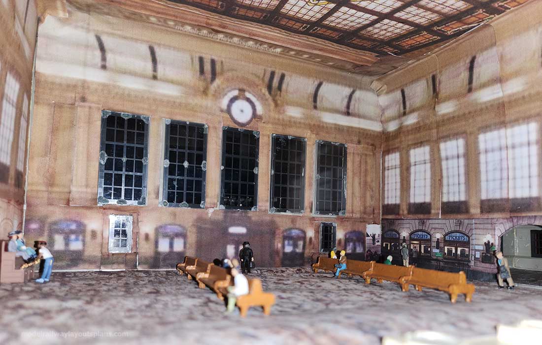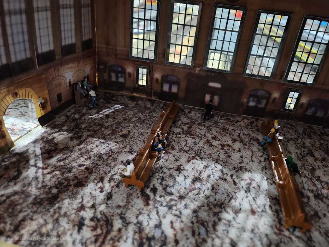 There is a beautiful stained glass ceiling in the real main waiting area. I used photos of that so that a visitor can look inside to see the ceiling, and also see the glass looking down at the roof. For the floor of the waiting room, I photographed a portion of the granite countertop in my kitchen, reduced that, and glued it in place. I finished it off with a Woodland Scenics shoeshine stand, benches that came with several Walther’s butterfly roof station platform kits that are installed outside of the terminal, and a bunch of seated and standing figures.
