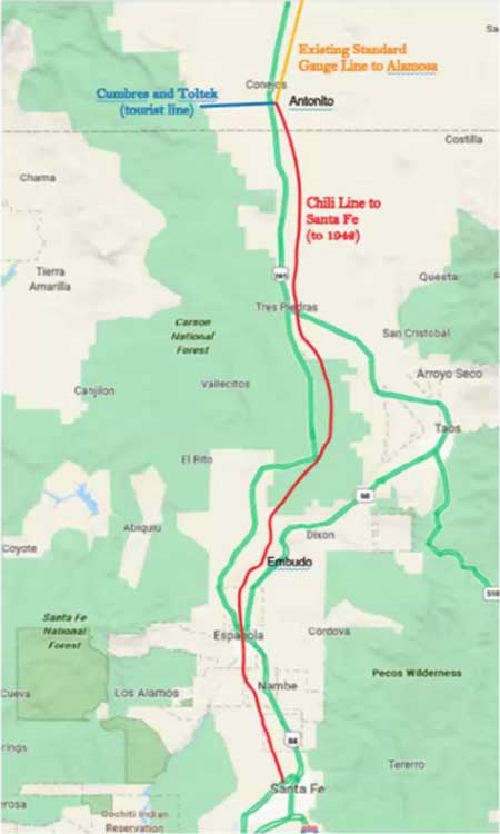 At Antonito the line continued onto Chama, New Mexico, on what is now the Cumbres and Toltek tourist line. Also leaving Antonito was the narrow gauge Chili Line down to Santa Fe, New Mexico.