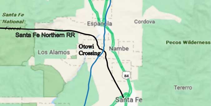 At a place above the ghost town, Embudo, the line dropped over a steep grade down to the Rio Grande river. At Embudo you can still see a turntable pit and another water tower. The line then followed the river, through Española. It crossed the Rio at a place named Otowi crossing, then proceeded to Santa Fe.