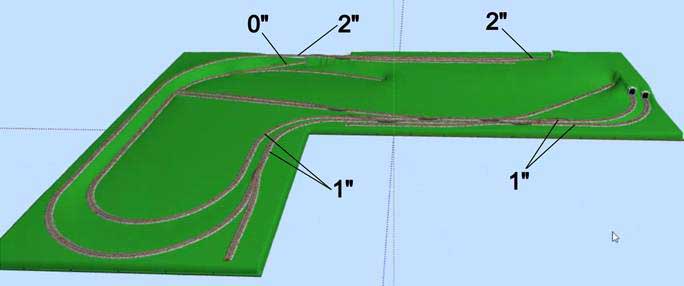 Below is the 3D version of the plan showing track elevations at key points. The lowest point is at Otowi with an elevation of 0”. Tracks rise up to Santa Fe and the yards at 1”, then continue up to the mine at 2”. By breaking this up into three main elevations, the track inclines are decreased by half—this brilliant change was suggested by a viewer of my YouTube channel.