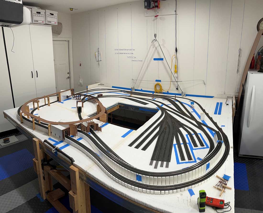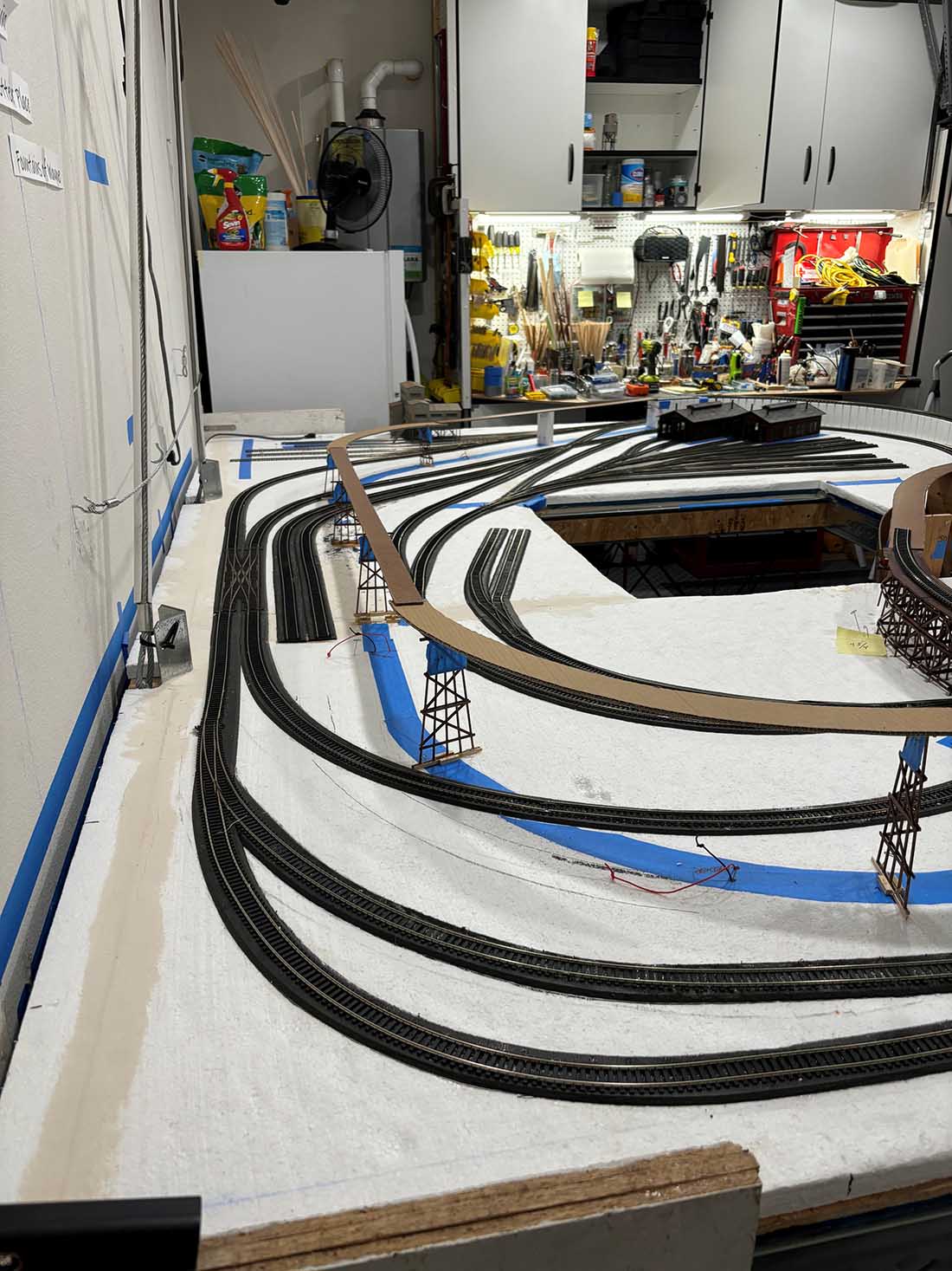 I’m going to build all my own tunnel entrances and two wooden trestle bridges. I’ve already completed one bridge that’s about 2’ long. So far, I have about 90% of the track laid, the remainder of it is elevated plus I still have a 14’ wooden bridge to build.