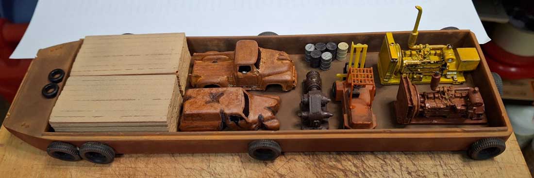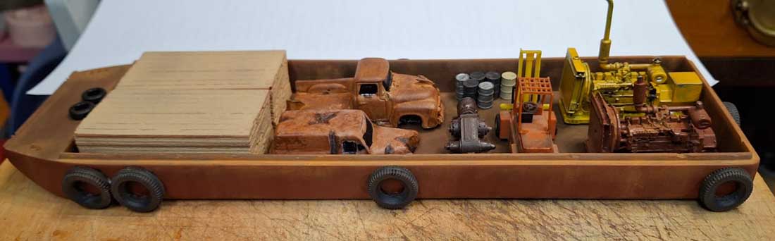 I used some details from my bits box to fill up the hull. (Note the 3D printed generator sets at the back in the 3D printed hull). Scrap vehicles on the way to a scrapyard.