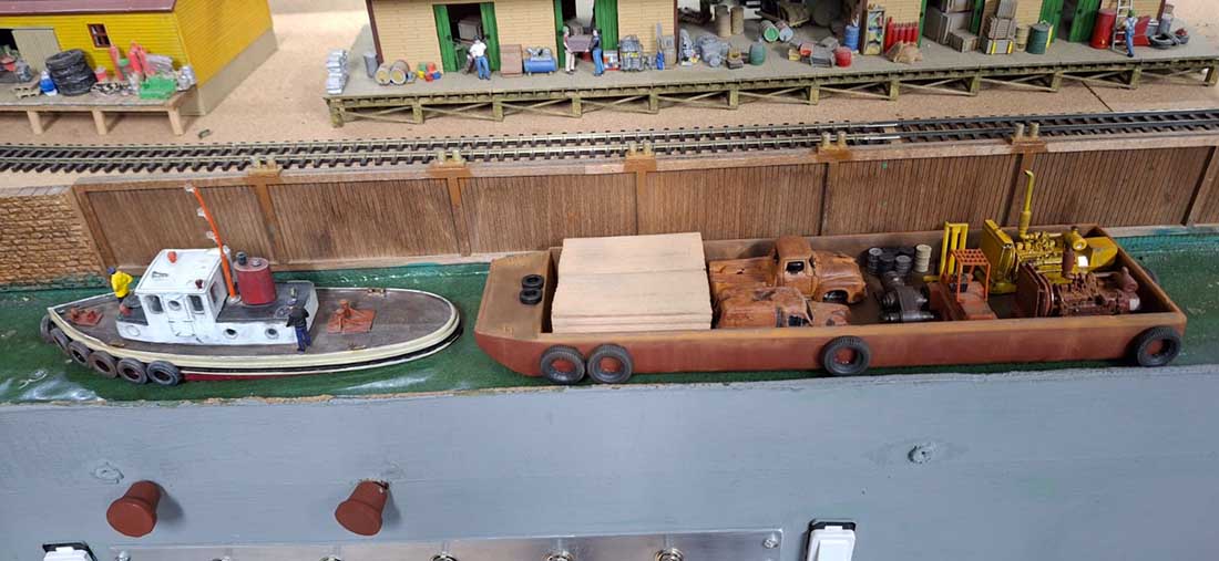 Really great to see your talents displayed here. Love the barge & the boats. After its all complete it will be hard to figure out if its real or a model.