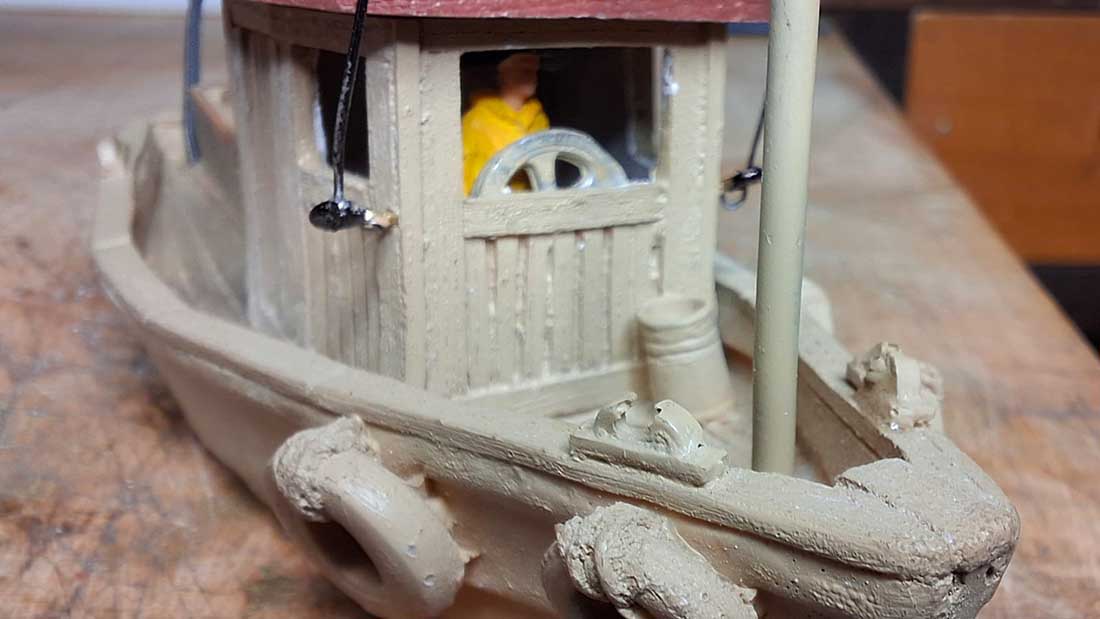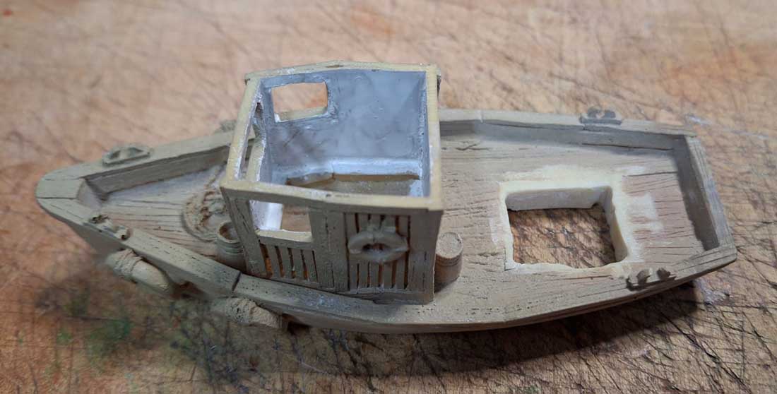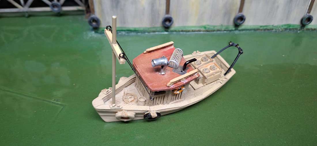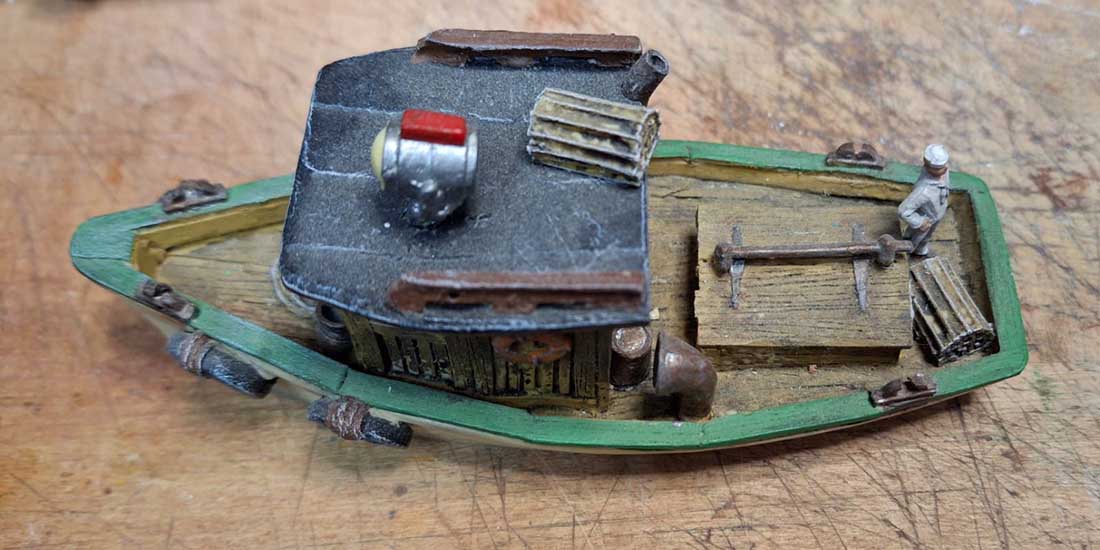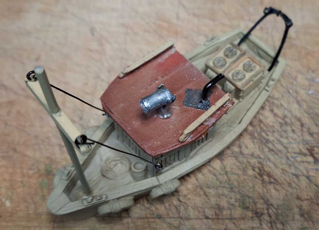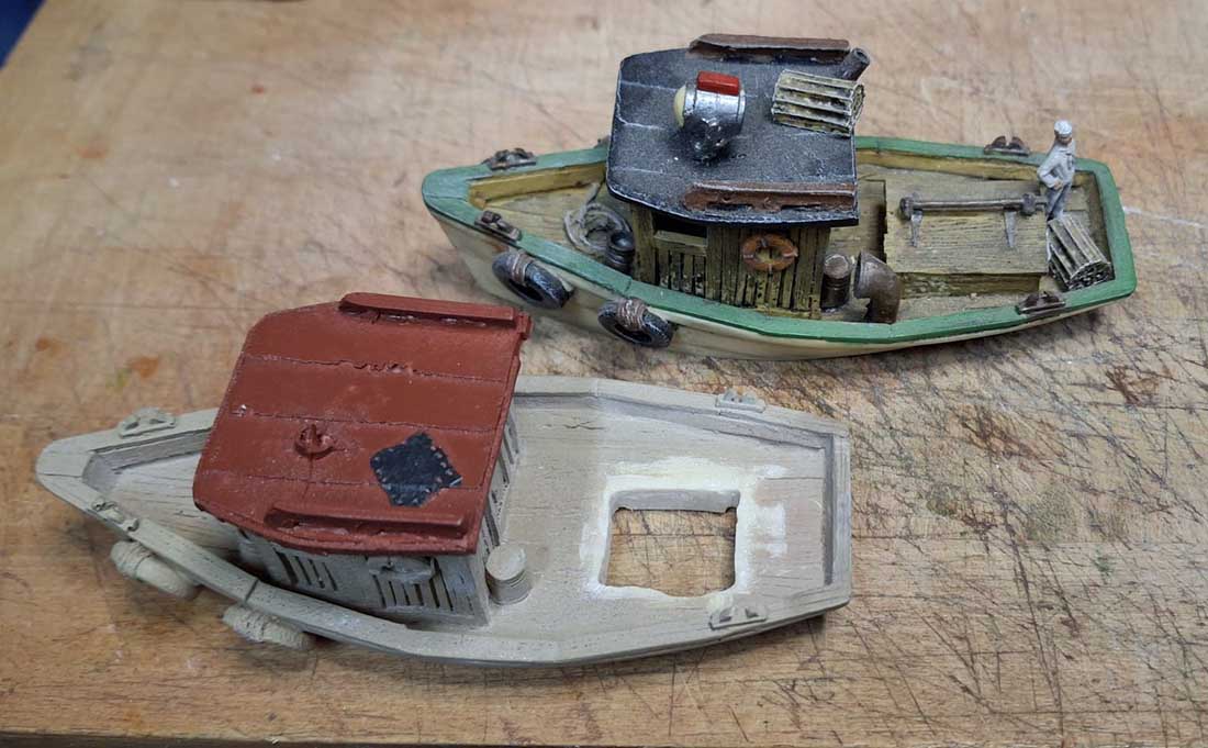 It now needs to be completed – the hull painted then the deck edges, bumper tyres painted and a final weathered coat and a lobster cage on the roof. I will add fine netting used to catch the fish at the back.