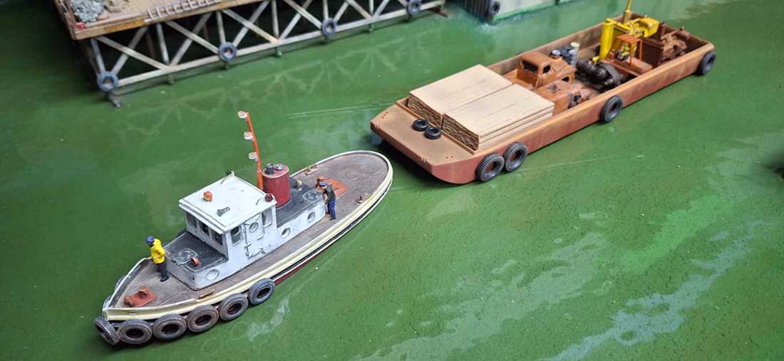 A resin Tug boat kit painted and weathered many years ago towing the barge.
