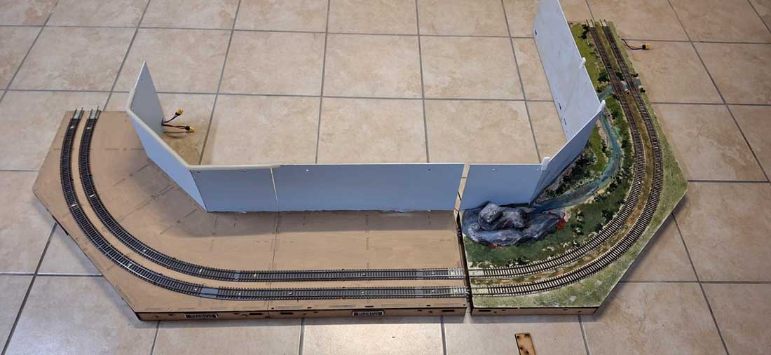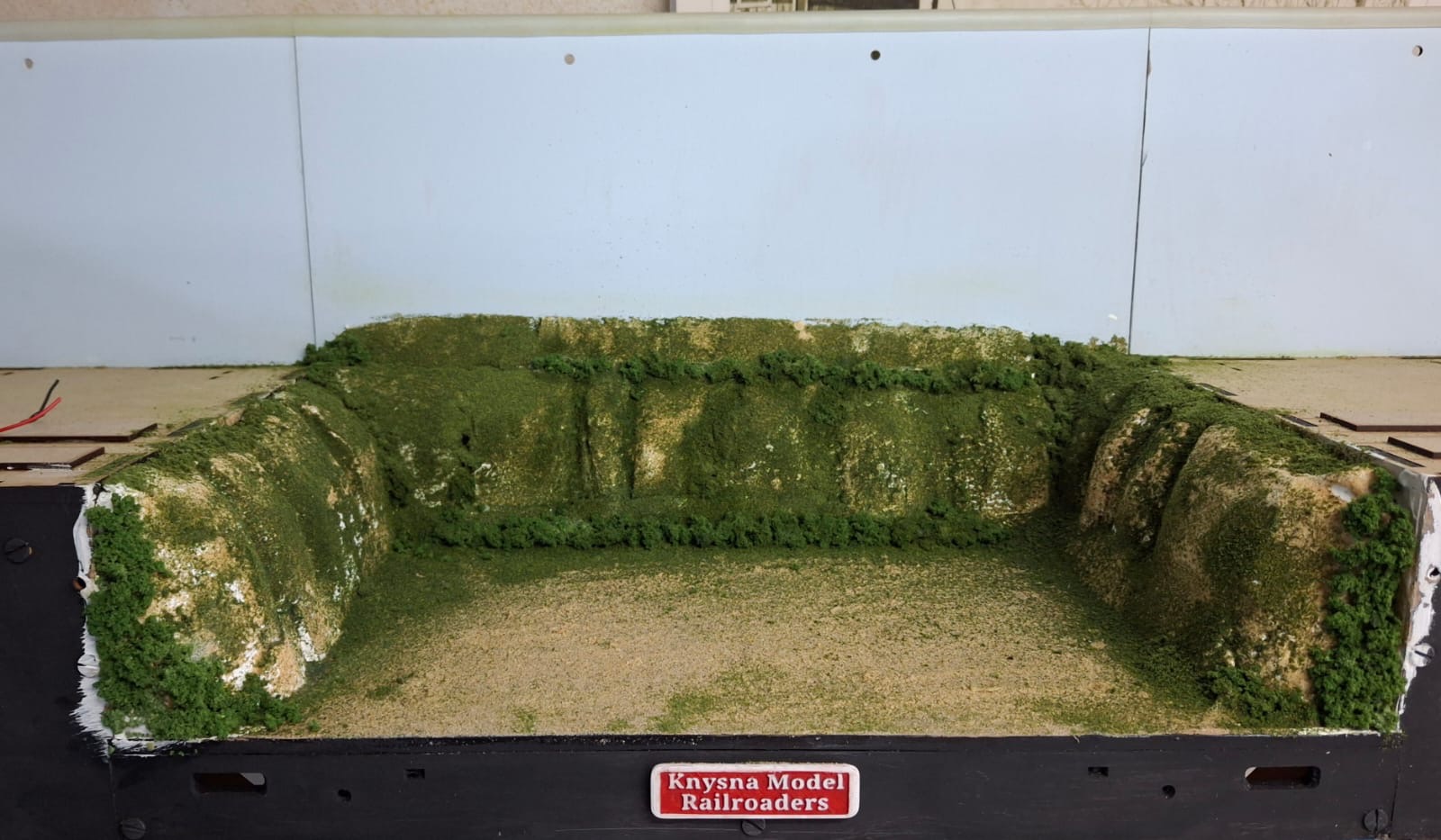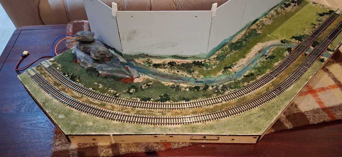Below is one of the members modules that is almost complete with track and scenery. The wiring and connectors can be seen at left.