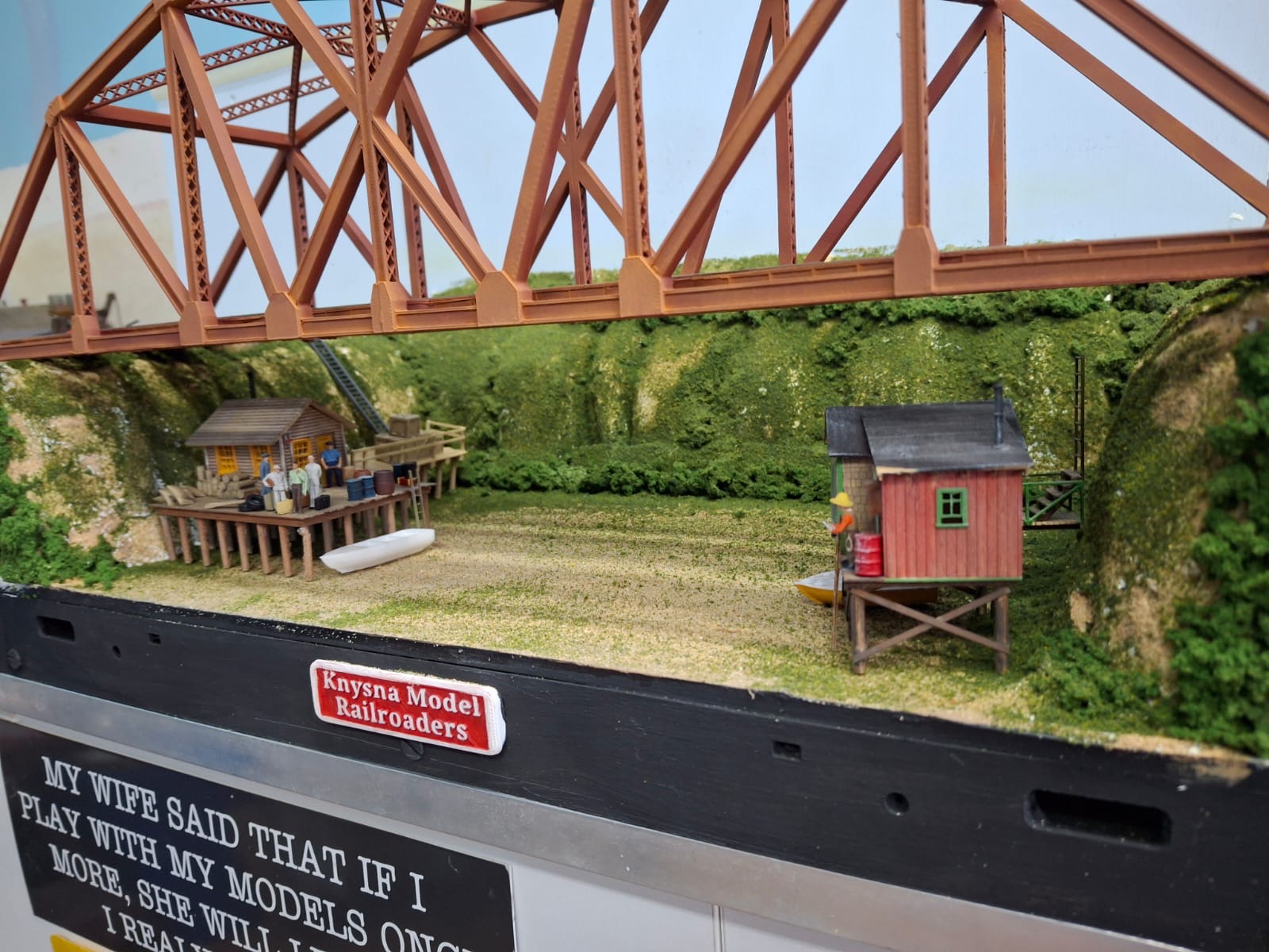 The top bracing has been added, glued and it increased the strength and stability very well. As can be seen here, under the bridge, a 3D printed boathouse and deck.