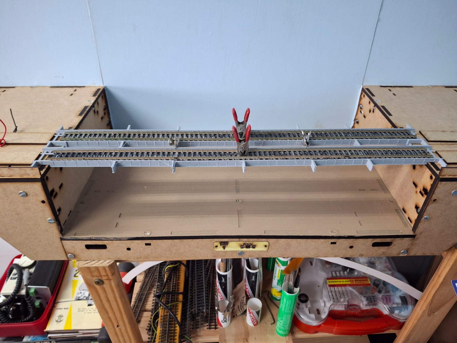 The sides have been glued to the base girders and being tested with a heavy high speed HO scale train to see if the bridge can handle the weight without any sag. It turned out to be very strong indeed.