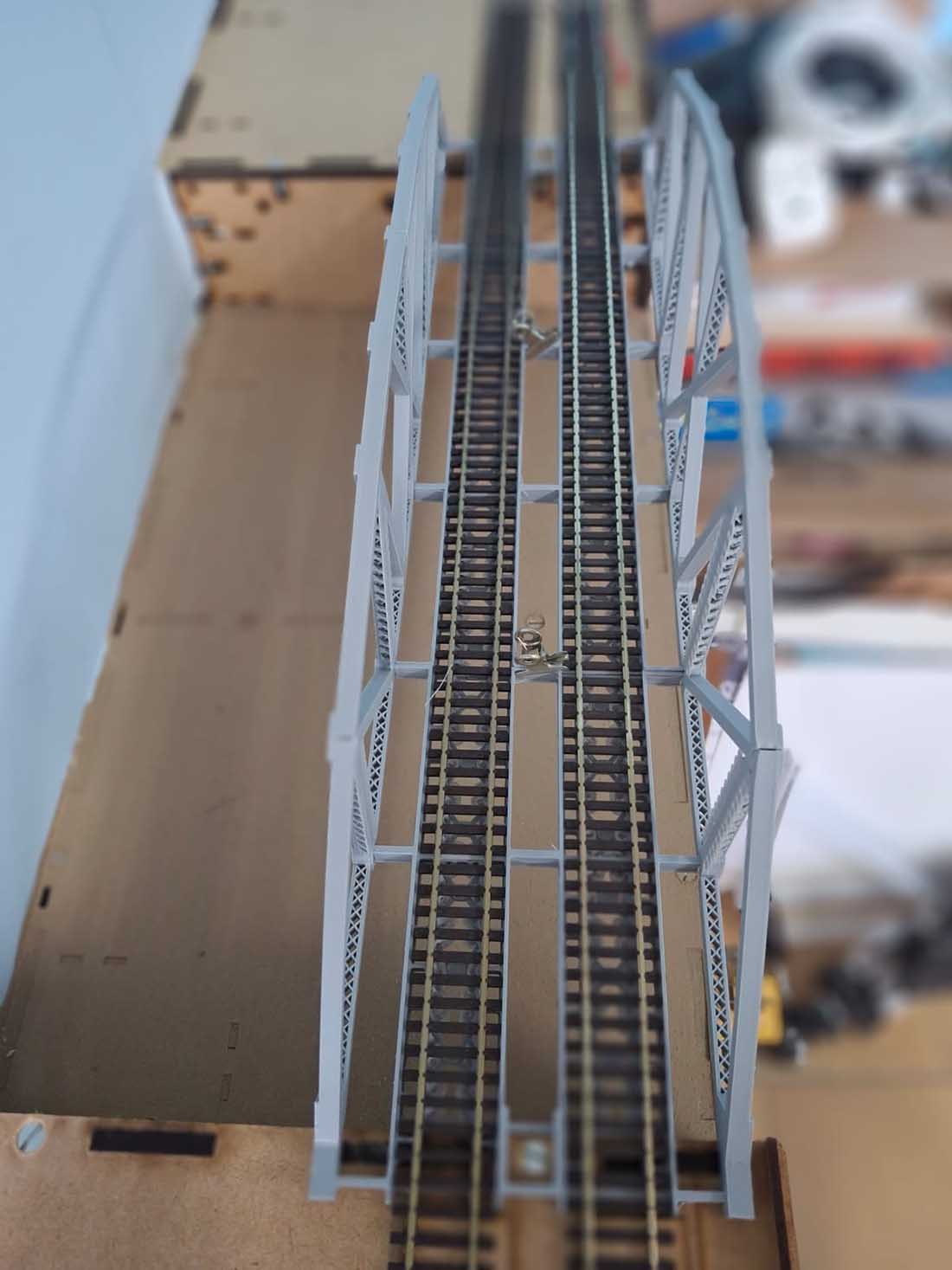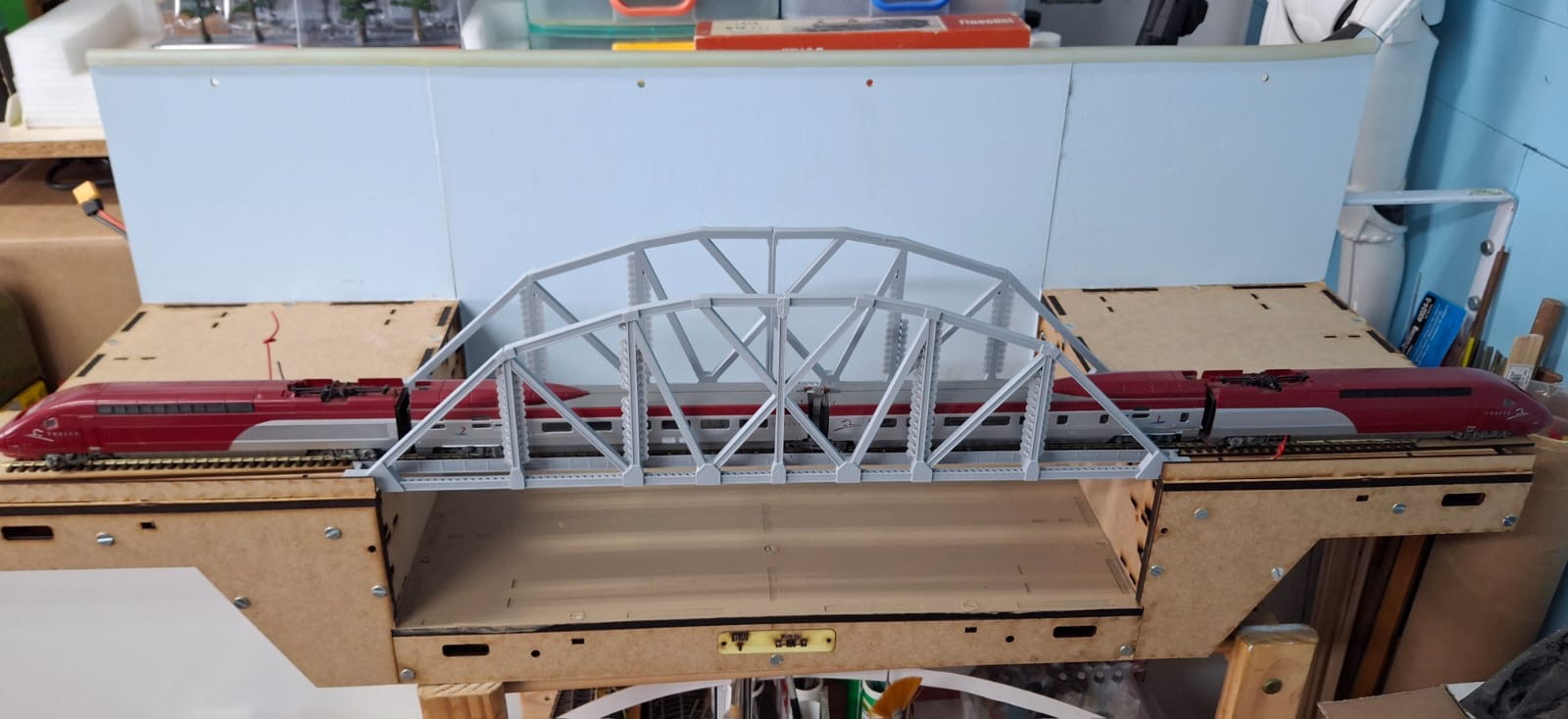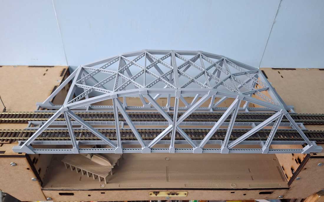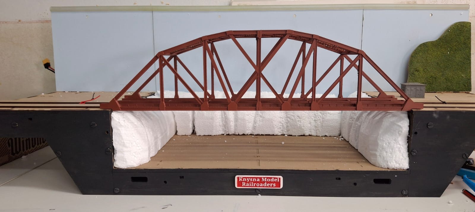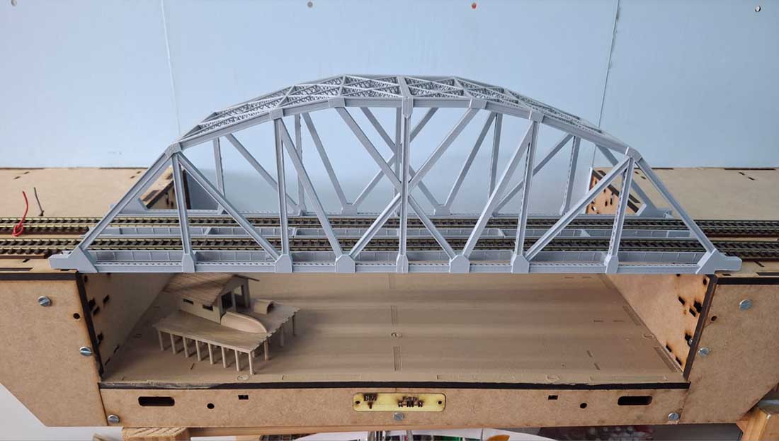 Fortunately a few members have 3D printers therefore they could print a 3D bridge for this module. Below is the subframe of the bridge. The gap in the middle for a bridge or trestle is 500mm by 300mm by 100mm deep.