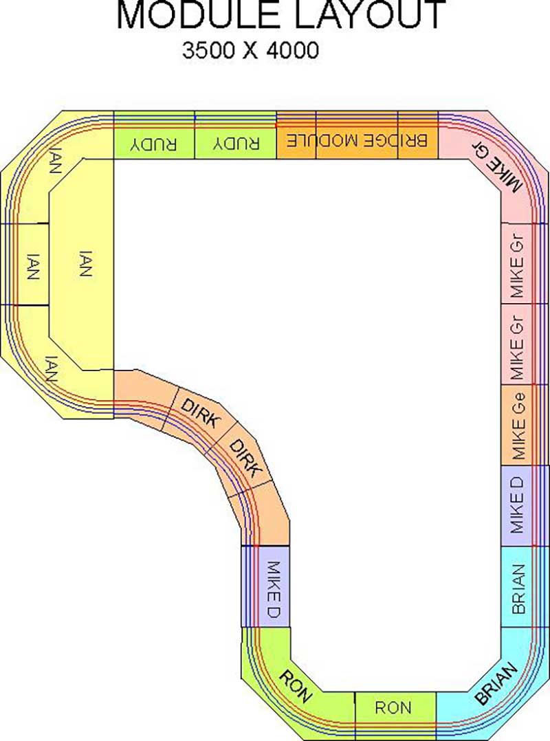 Below is the ideal set-up using all the groups modules for exhibition purposes. As can be seen below there is what is called a reverse curve unit (Dirks) to enable us to come up with this design.