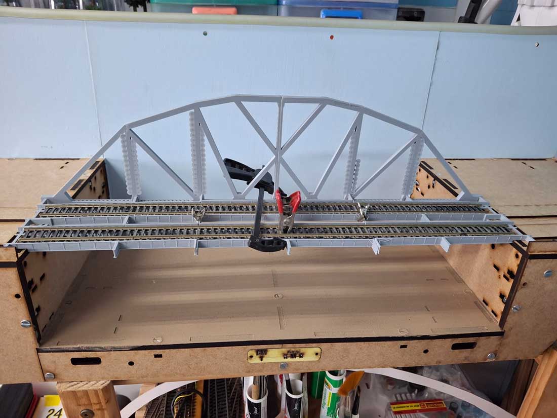 One side of the bridge clamped in position and glued to the base girders. The total number of 3D printed parts is 18 that need to be glued together. (I used super glue)