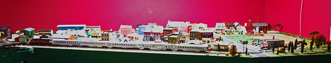 This is addition I had to add to make the operations scheme work. We also needed a town. The tracks are part of a turning loop and become an arrival and departure track. In the ops sessions a train first arrives at the yard (not shone here) and drops of the caboose. It then proceeds to the addition and makes the loop and backs in to an arrival track. The locos go the servicing area and a switcher comes and pick up the string of cars and rearranges them into another train. The new train is moved to the departure track and a new set of locos picks them up.