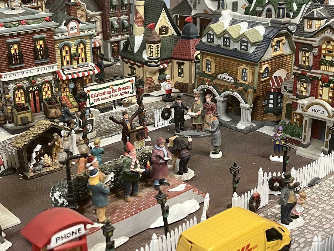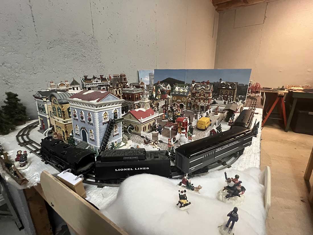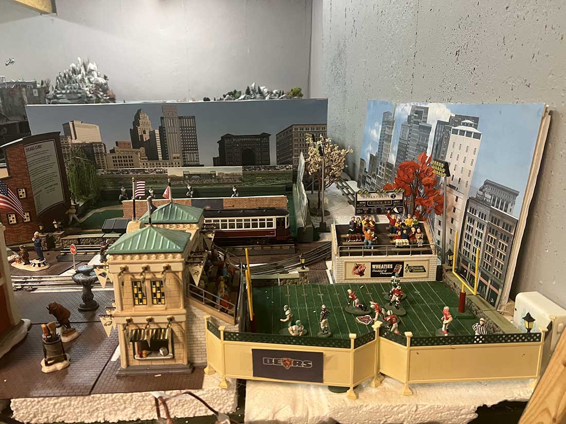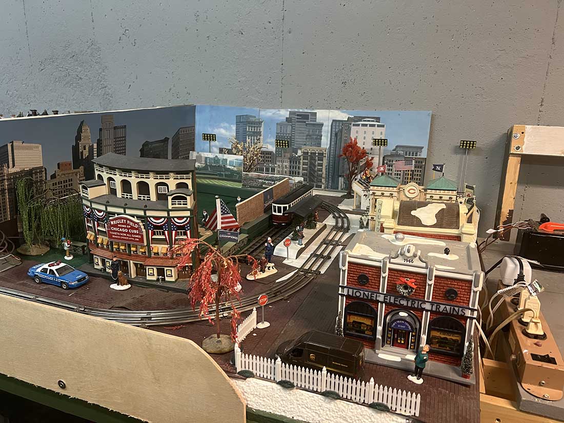 Second is that I have revitalized the remnants of my 027 gauge Christmas Village with an adjoining section for Wrigley Field and Soldier Field (Department 56 porcelain structures).