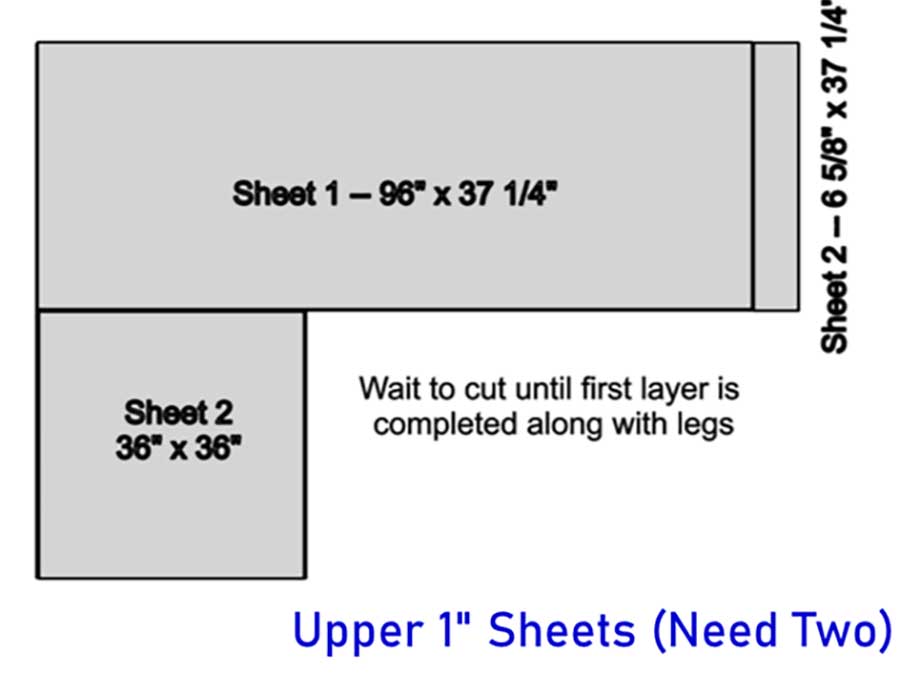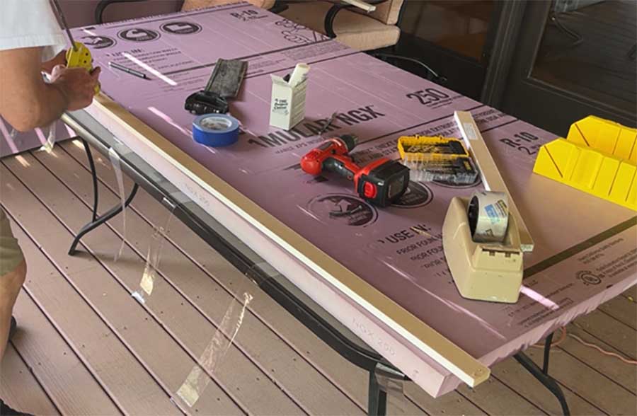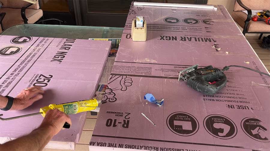 Rather than plywood, I used two sheets of 2-inch purple foamboard, cut to size and glued together with Liquid Nails. The edges of the foamboard were surrounded with 1×2 boards which were cut and glued to the foam with Liquid Nails and screwed together at the joints.