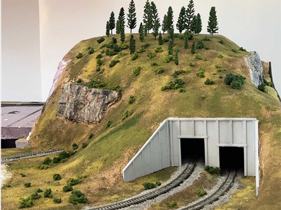 The pine trees on the mountain are from Fazhbary (Amazon) and came in a bag with 44 pieces of model trees, 1.4 – 5.9 inch. Since the largest one were too big for N Scale, I cut off the tops to put in this part of the layout. I covered making and coloring rock formations earlier. When done, the mountain looked like the first photo. Since the tunnel portals had to be custom size, I designed them and printed them with PLA on my 3D printer.