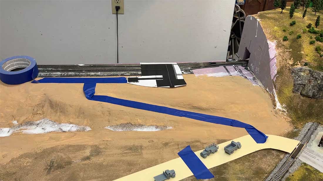 I built up the dry wash gully area (arroyo) with fine sand wet with diluted while glue and marked off where I wanted the gravel road to go with blue tape. The yellow paper is cut lengths of card stock which form the patterns for continuing the road. The black area on the paper on the above level indicates where I’m going to put a coal mine using a Walthers Diamond Mine kit that I’m working on.