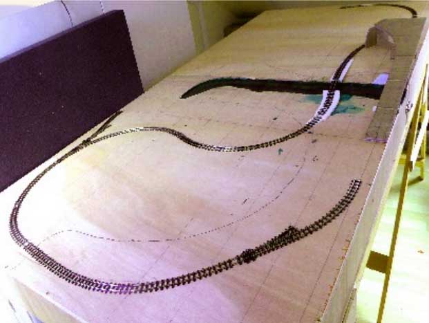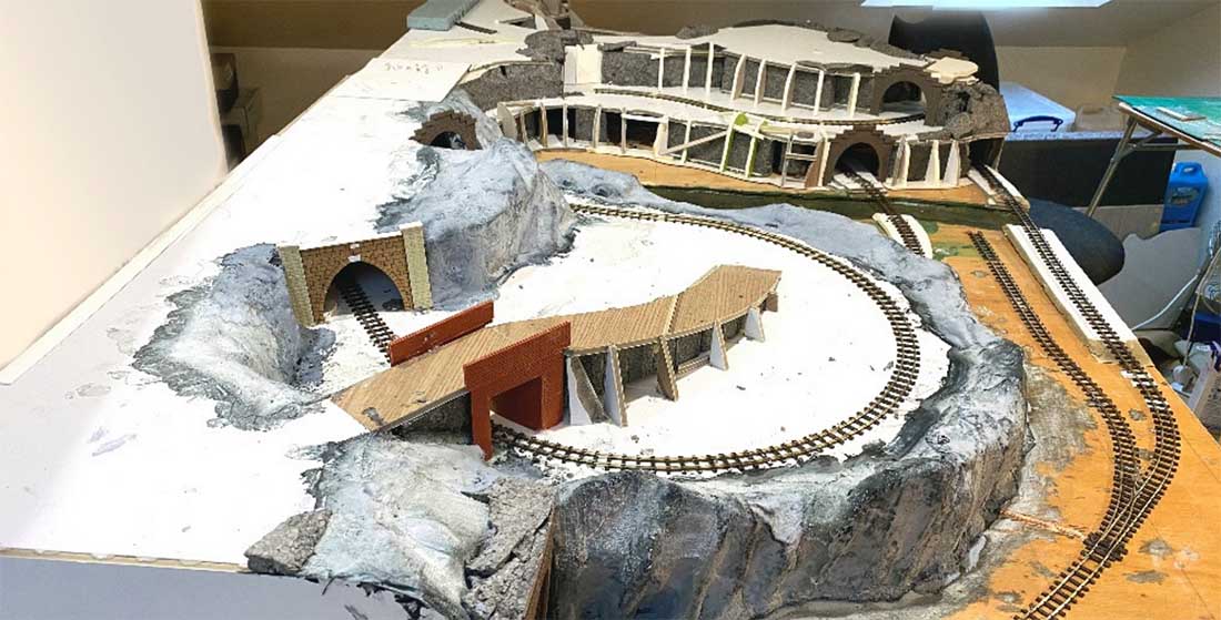 Vertical surfaces are covered with several layers of plaster bandage. Foam board being very light, it is easy to lift off the upper areas to clean the track and cope with de-railments, although this is not a task to be taken lightly because the track has to be re-connected where it changes levels.