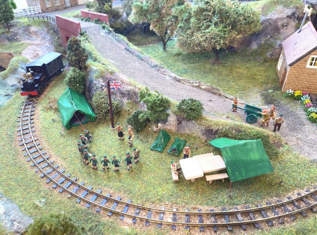 Since I enjoy building rather than running a railway, I wanted to include a number of village buildings, a quarry and a farm. The quarry is taken from a 1920’s photo of Hook Norton Brymbo Works and my life-long Scouting membership prompted the Scout Camp.