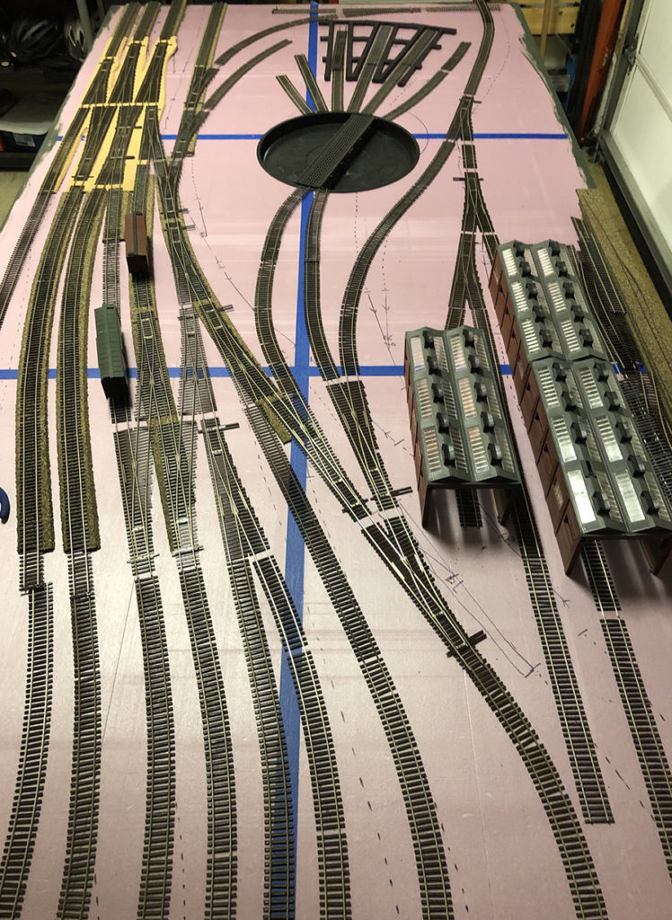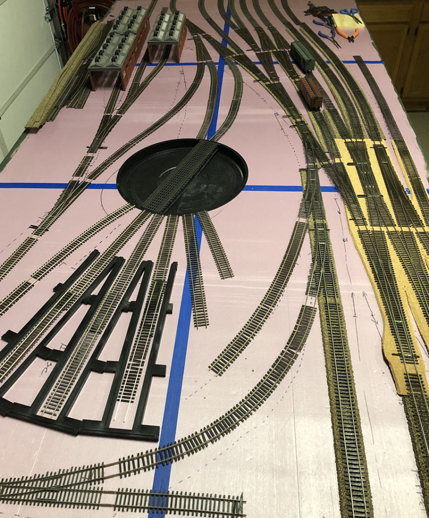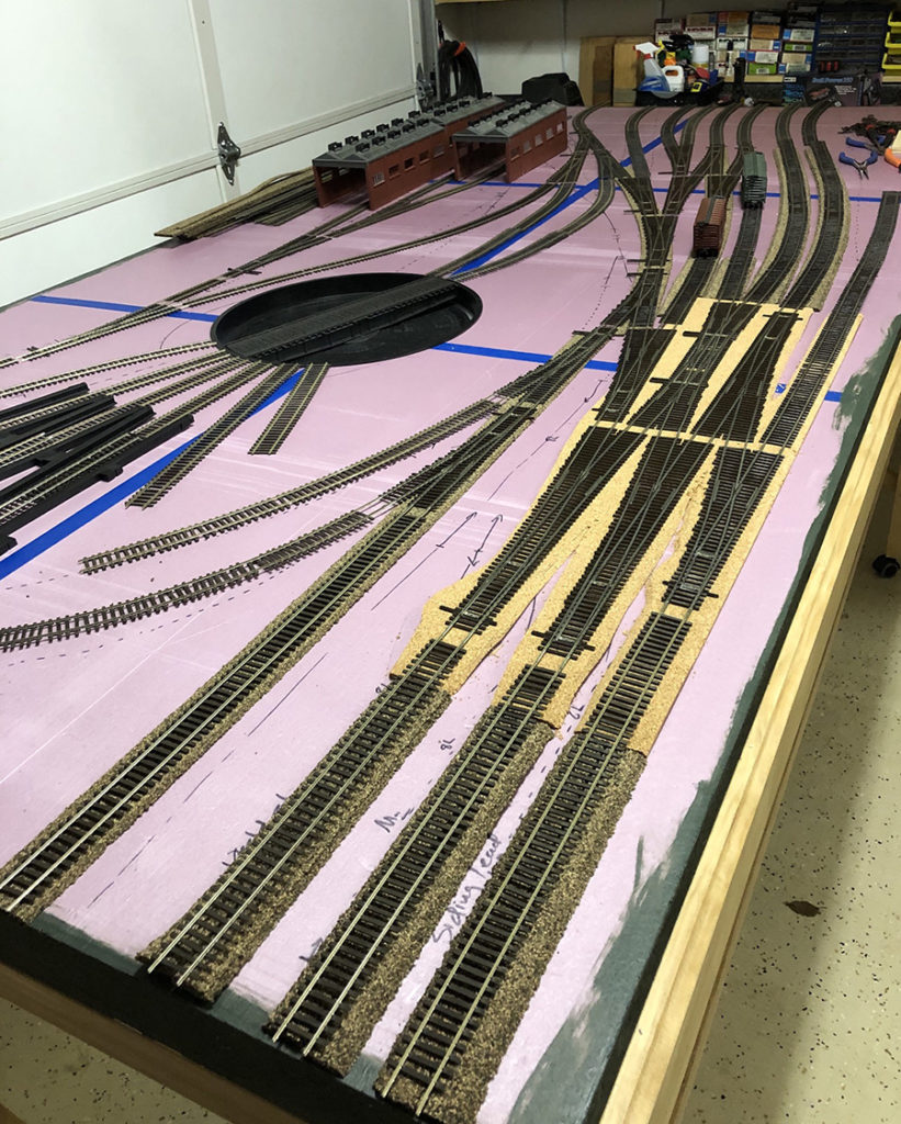 In the next couple of weeks I’ll get the cork in place and I’ll start wiring the switches and other track components then I’ll put the track in place and start to power it up. I’m using a mix of cork for road bed. I’m using HO scale for the mains. Then I will transition to N Scale cork on less important segments. Finally some of the track will go directly on the foam.