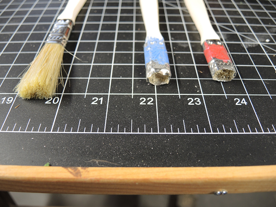 Next get some cheap ½” brushes and cut off the bristles right down to the metal binding. Using a drill remove the bristles down below the metal at least 1/8”. This leaves the metal binding exposed which will make the stone impressions in the foam board. You can make few different brushes and bend the metal into different profiles. Mark the tools you now made with different markings so the you will get different shape stones.