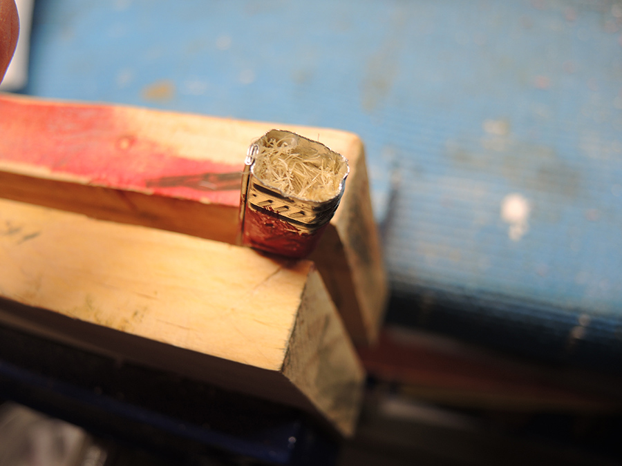 A coating of dry brushed black using a fan brush.